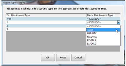 You may also get a screen for mapping the account types in your import file to Meals Plus account types.