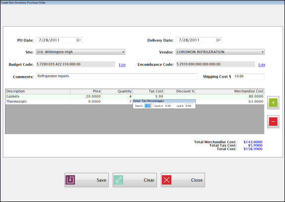 To enter tax, type a number into the Tax Cost field. It will open a window where you can enter the State, County and Local percentages. The tax cost will be calculated automatically based on the percentages entered.