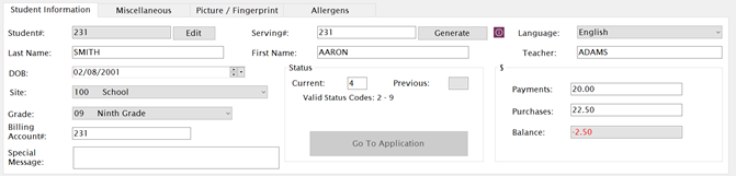 If a student transfers to another school, change the Site on this screen. You must have security rights to both sites. If there is a balance on the account, an adjustment transaction will be written to show that the balance was transferred.