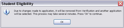 If the application is changed so that it becomes EXEMPT from verification (the household is changed to Homeless/Migrant/Runaway, or a student becomes Direct Certified) it will also be removed and replaced. You will get this message if an application is replaced: